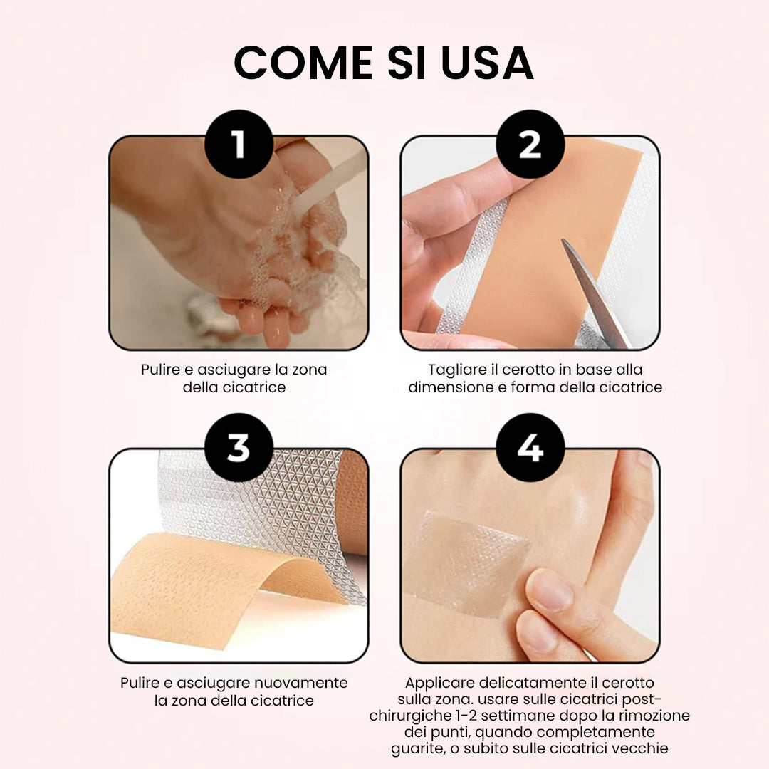 Il cerotto per cicatrici è progettato per ammorbidire, appiattire e attenuare le cicatrici nel tempo. Crea una barriera protettiva che idrata il tessuto cicatriziale, migliorandone naturalmente l'aspetto.